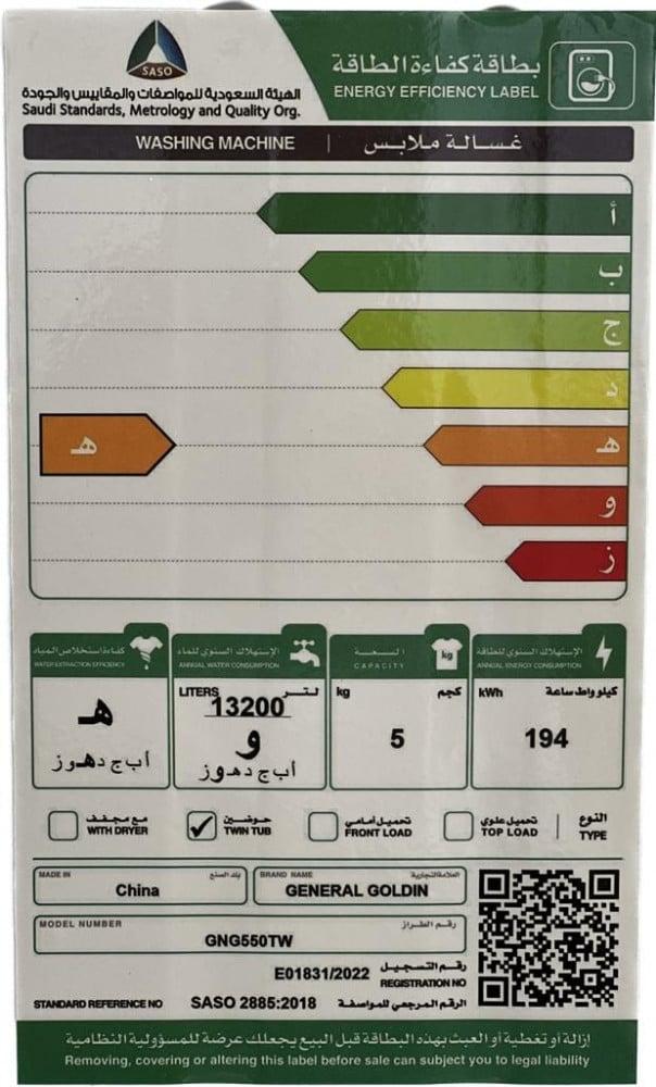 تمتعي بتنظيف فعال ونتائج مميزة مع غسالة جنرال جولدن بسعة 5 كيلو وحوضين، حيث توفر لك أداءً قويًا مع استهلاك اقتصادي للمياه والكهرباء. بفضل تصميمها العملي، يمكنك غسل الملابس وشطفها بسهولة دون الحاجة إلى انتظار دورات طويلة.