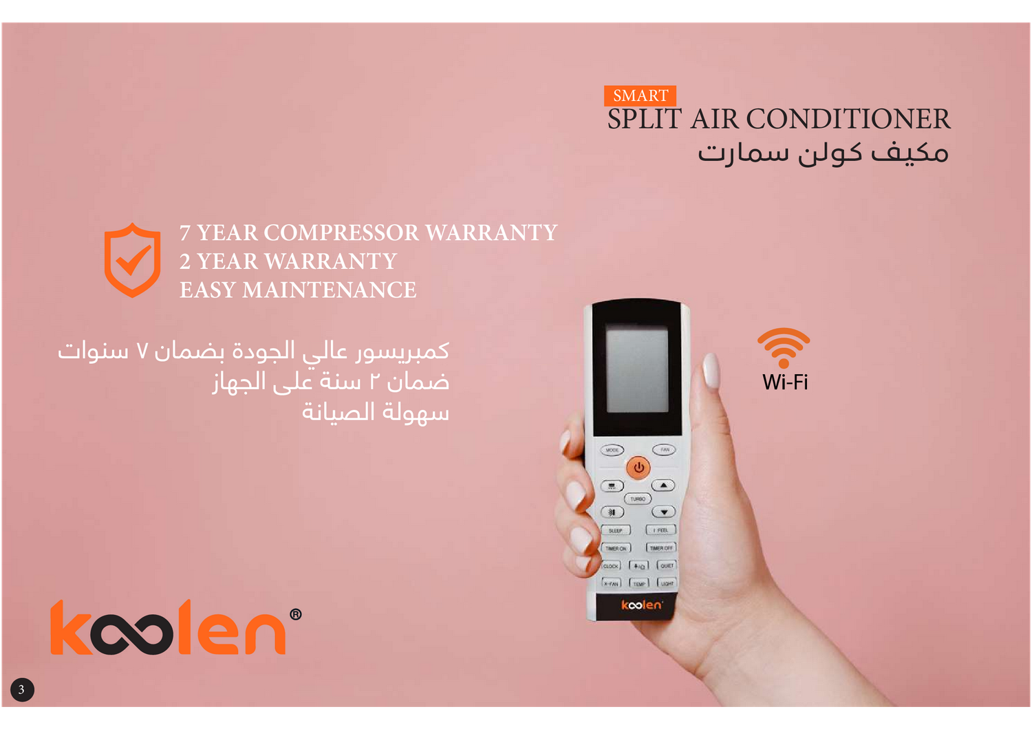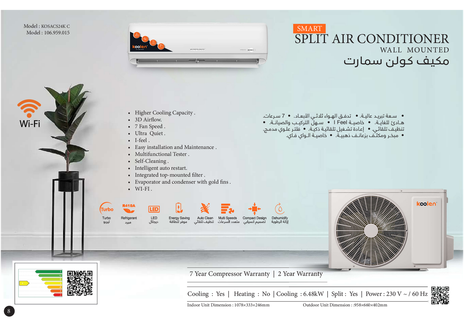 خاصيــة الــواي فــاي - ســعة تبريــد عاليــة - تدفــق الهــواء ثلاثــي الأبعــاد - 7ســرعات - هــادئ للغايــة - خاصيــة - Feel - ســهل التركيــب والصيانــة - تنظيــف تلقائــي - إعــادة تشــغيل تلقائيــة ذكيــة - فلتــر علــوي مدمــج - مصنع جري - تحميل تطبيق Ewpe smart للاتصال بالواي فاي